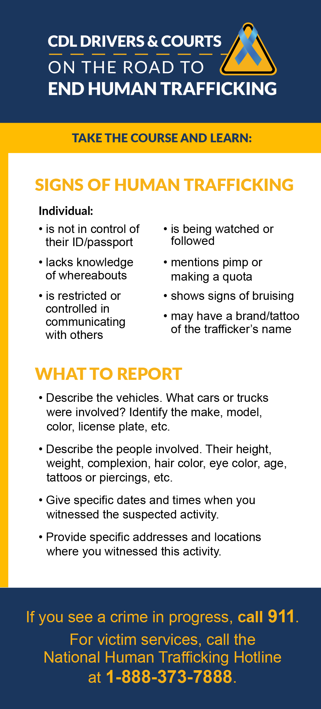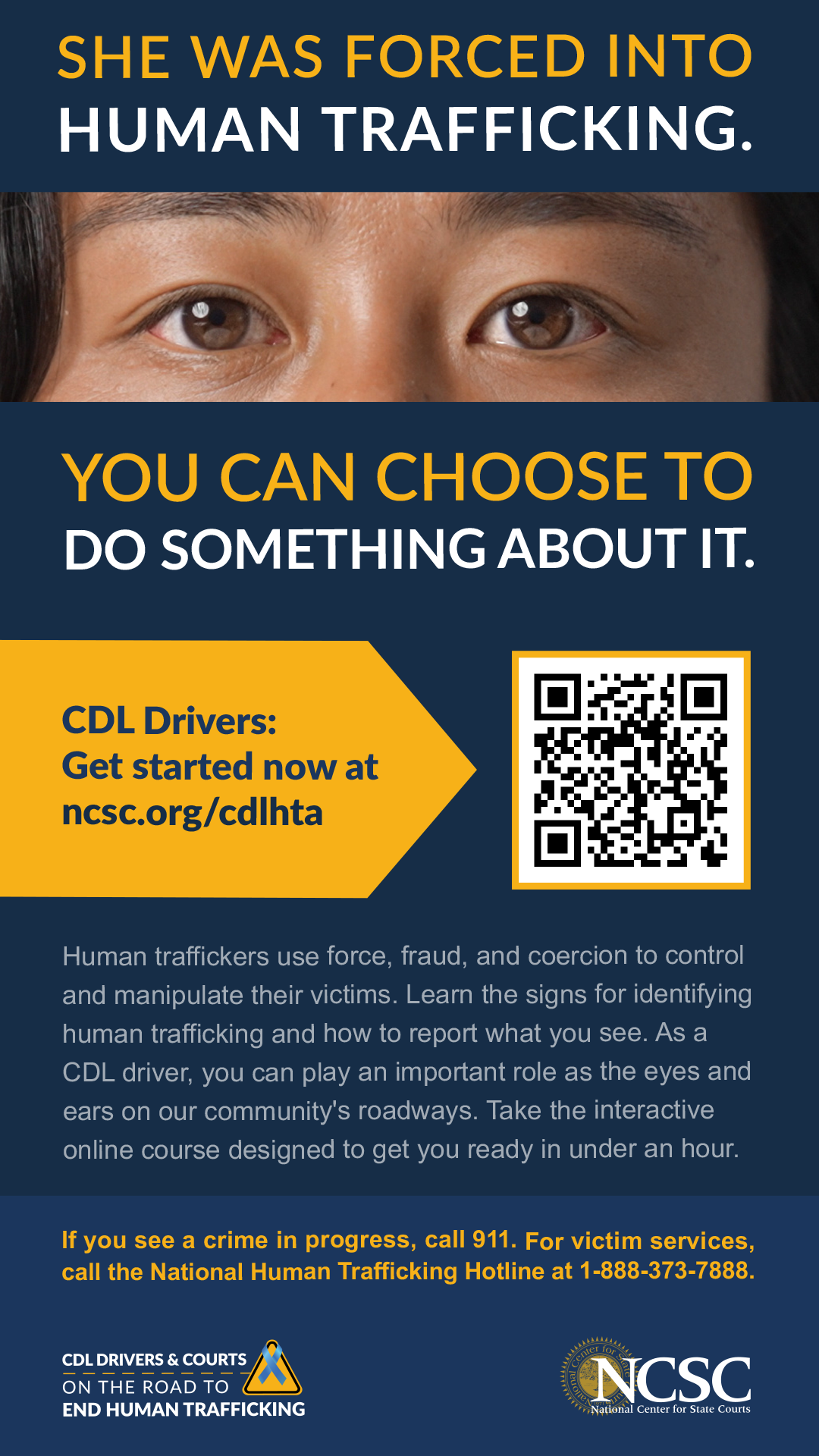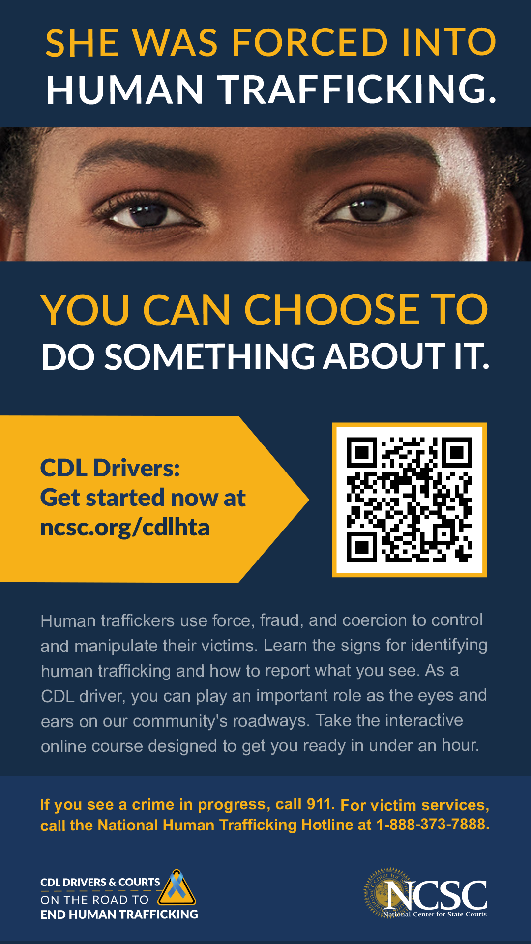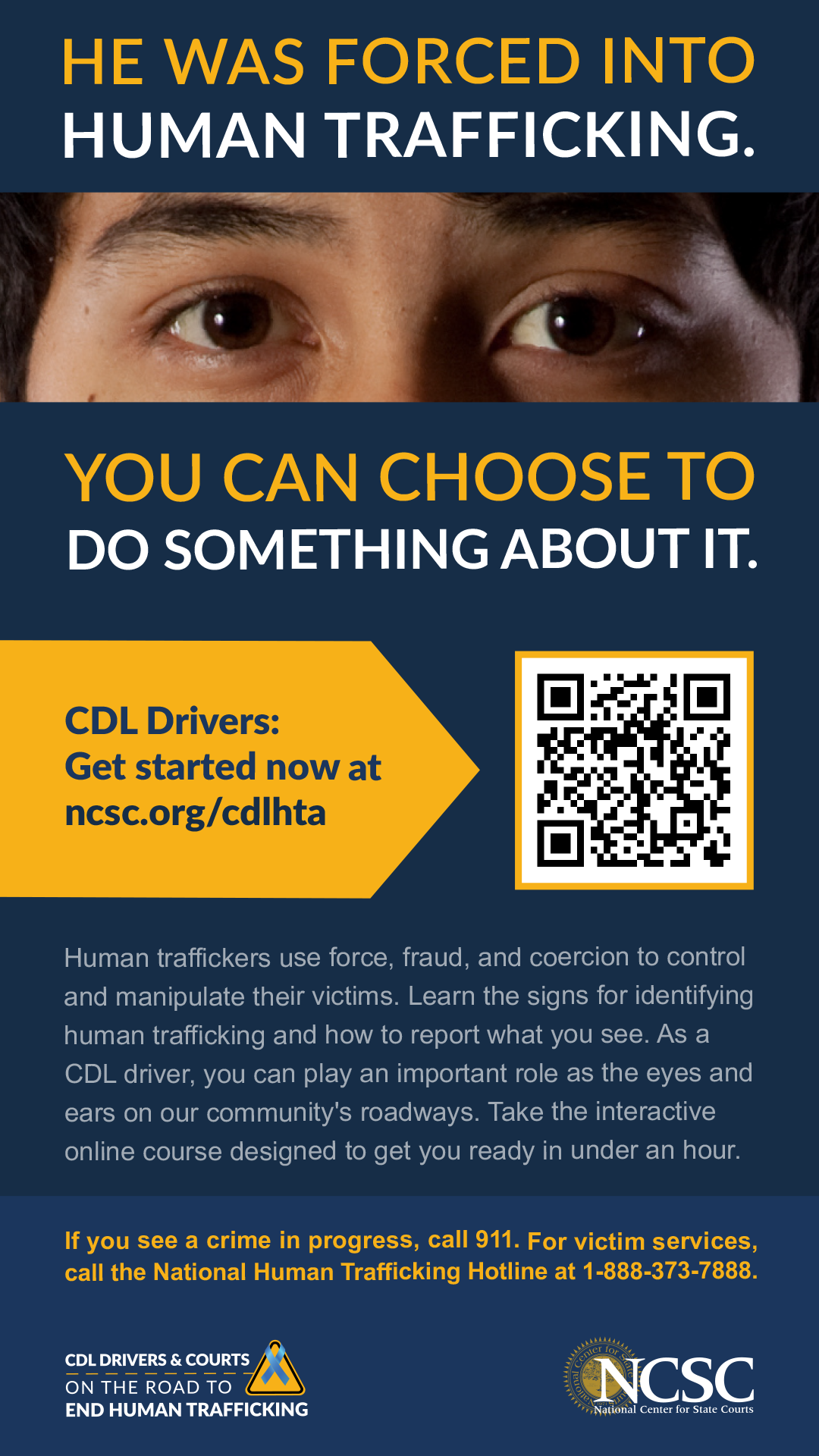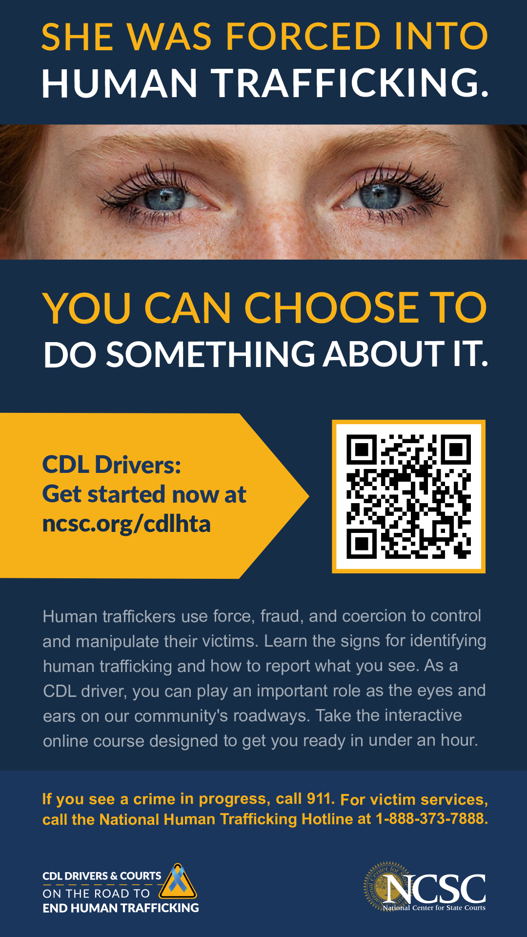 We are excited to inform you that our court is participating in a nationwide human trafficking awareness effort reaching out to CDL drivers like you. This effort is designed to equip you with the knowledge and tools to identify and report signs of human trafficking. Take the interactive e-learning course designed to get you ready in less than an hour.