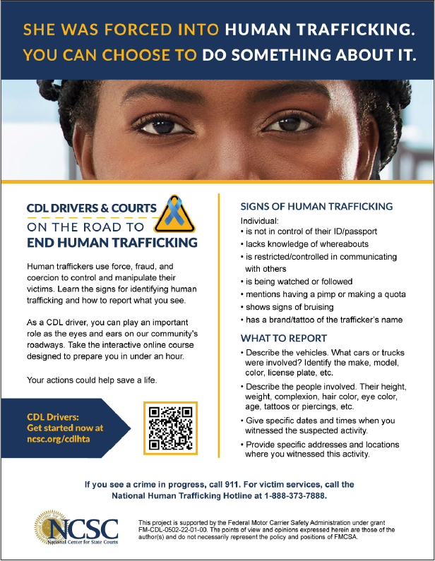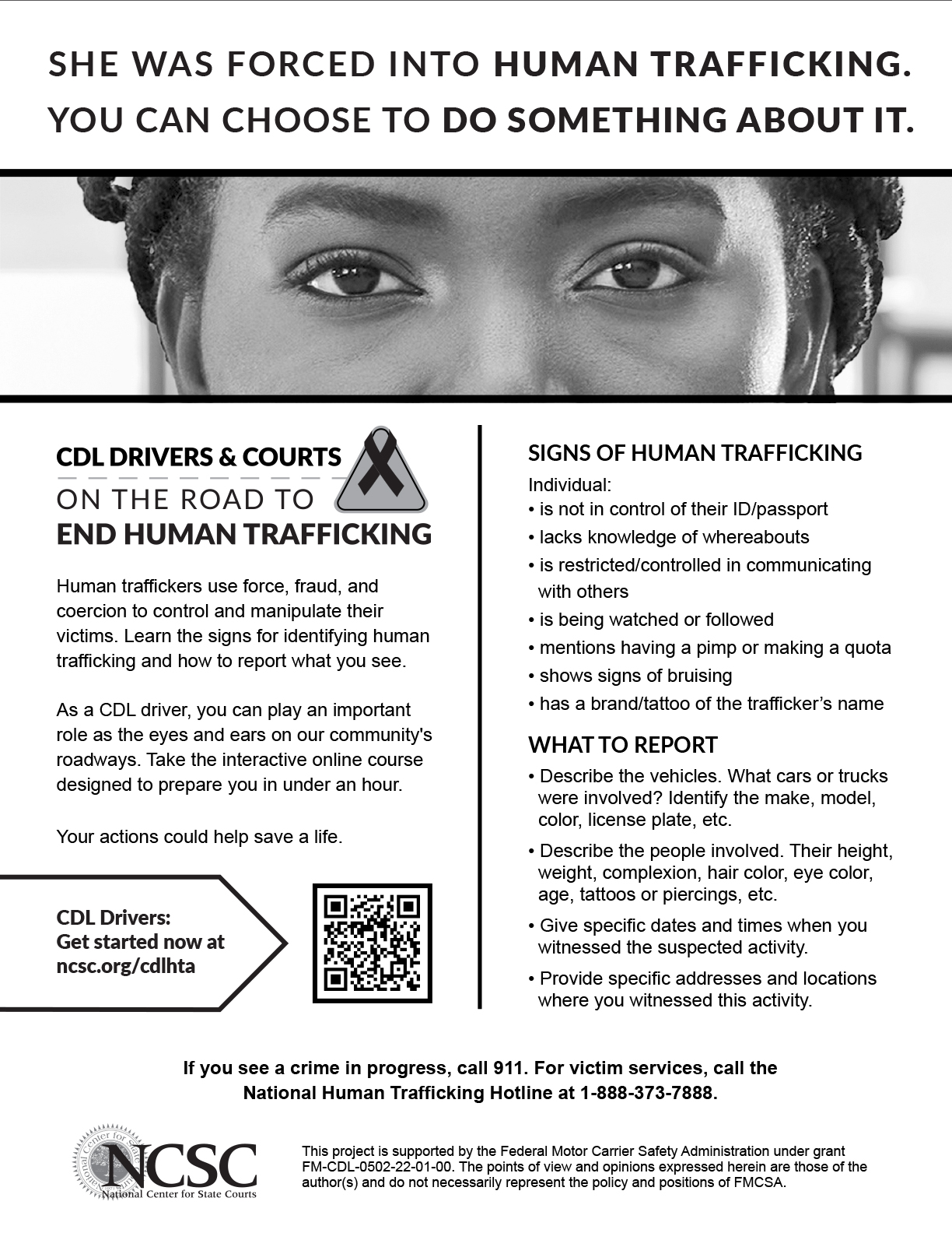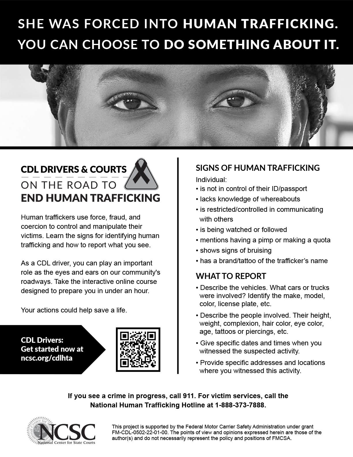 - Attention CDL drivers! Be the eyes and ears on our roadways. Learn the signs of human trafficking and how to report what you see. Together, we can help end human trafficking. Join in the effort at https://www.ncsc.org/cdlhta.