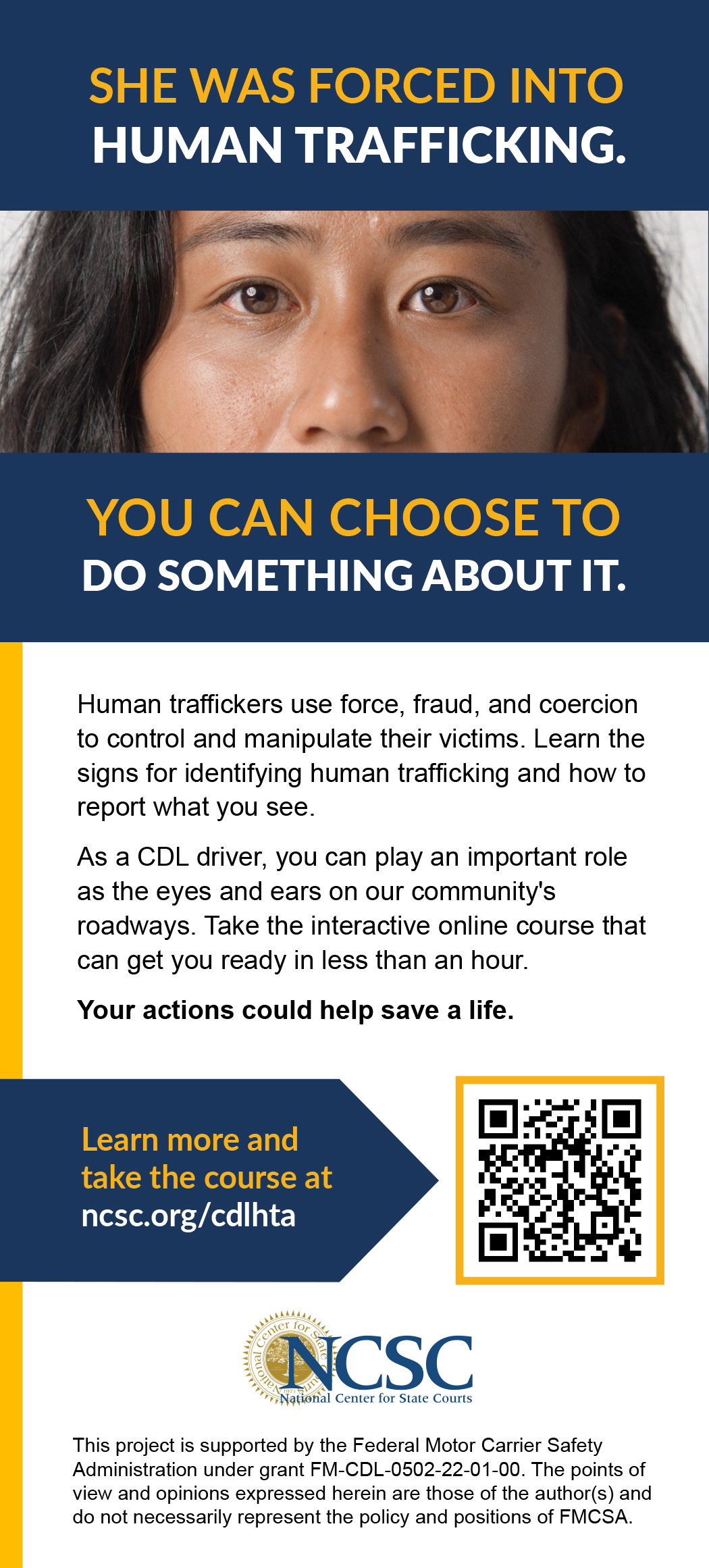 Ending human trafficking requires a collective effort involving not only law enforcement, government agencies, and advocacy groups, but everyday citizens—particularly CDL drivers. CDL Drivers & Courts: On the Road to End Human Trafficking plays a unique role in this effort by raising awareness among CDL drivers who interact with the court system. A central component of the initiative is an interactive e-learning course designed to educate these drivers on how to identify and report signs of human trafficking. CDL drivers are uniquely positioned to help combat human trafficking, as their extensive travels lead them to locations where trafficking may take place, such as rest areas and truck stops, thereby heightening the chances of them seeing, recognizing, and hopefully reporting potential trafficking situations.
