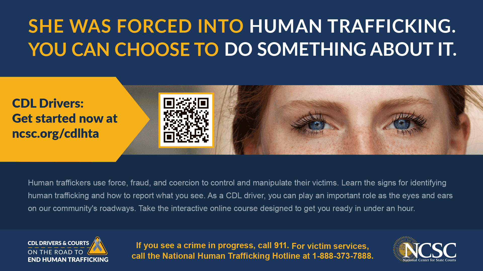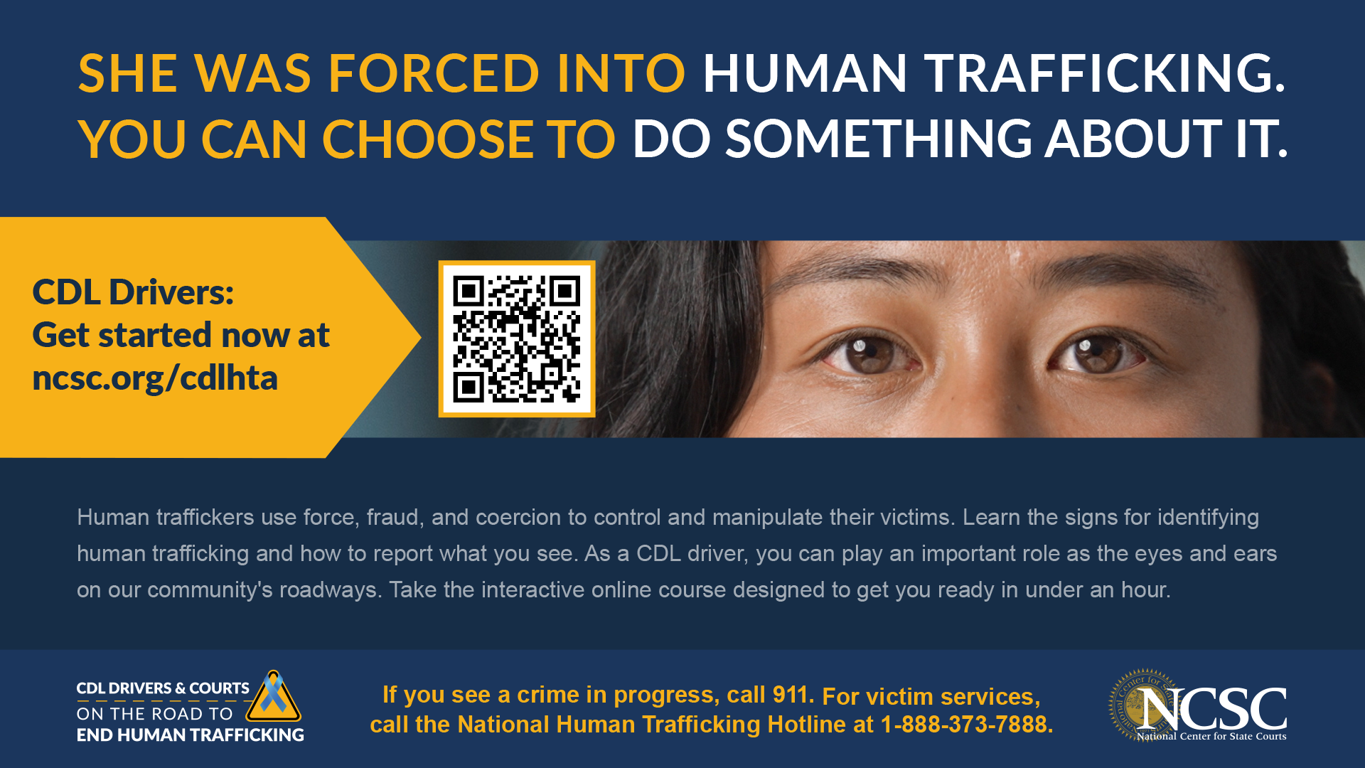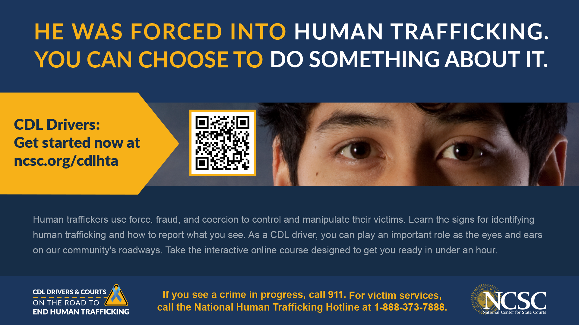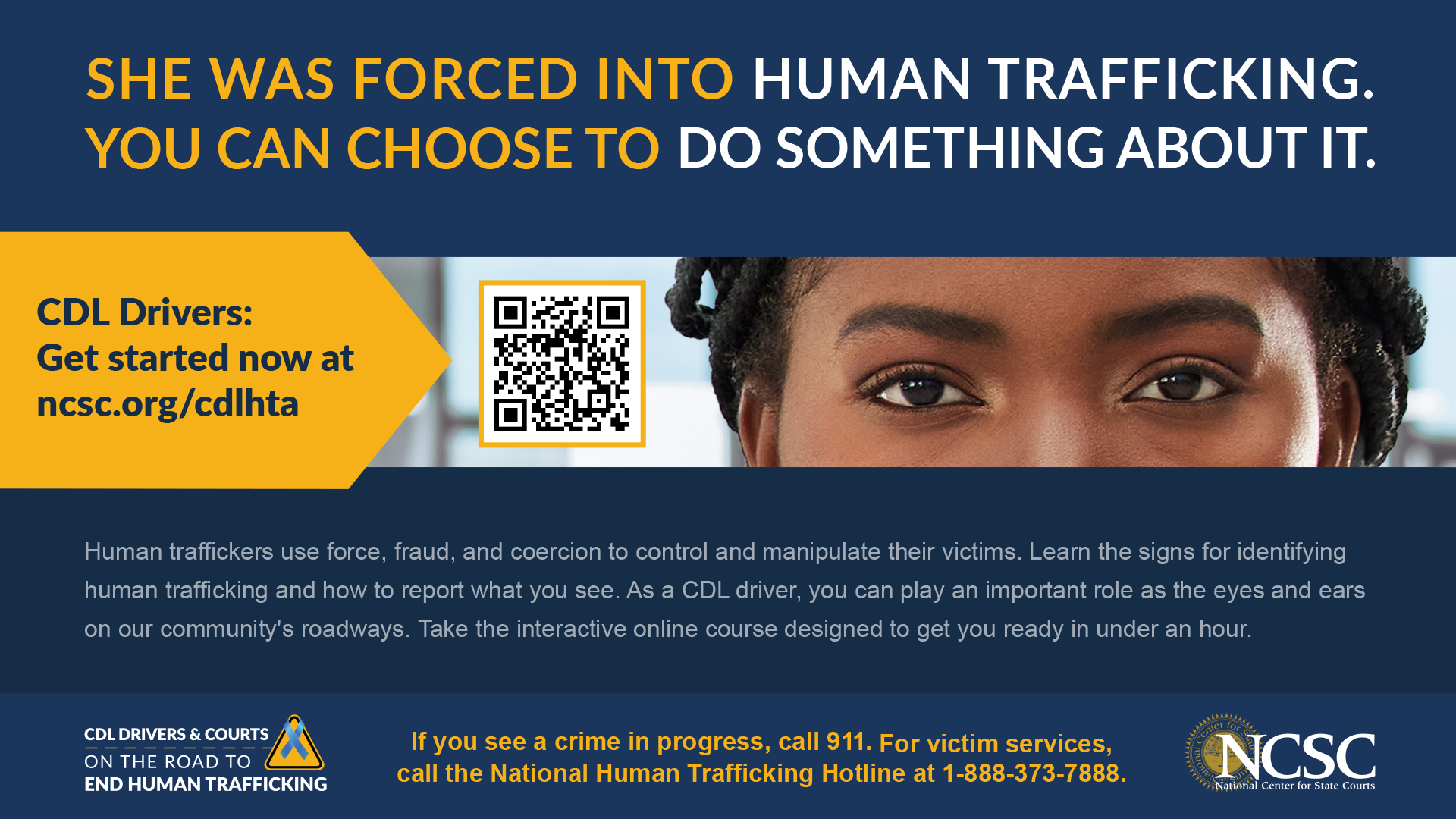 - Dear CDL driver. We invite you to join us in the fight to end human trafficking. While behind the wheel, you can be the eyes and ears on our roadways, identifying signs of human trafficking and reporting what you see. This e-learning course can show you how in less than an hour. Visit https://www.ncsc.org/cdlhta to learn more.